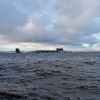 В субботу, 15 ноября, трудяги-буксиры помогли ракетоносцу отойти от причала Беломорской Военно-морской базы и развернуться по направлению к приемному бую. Узнаваемый силуэт с ярким гербом на рубке проследовал мимо "Архангельска" и был замечен на "Северстали". Эти два крейсера-гиганта выведены из состава подводных сил и поставлены здесь на прикол, хотя еще могли бы служить.
