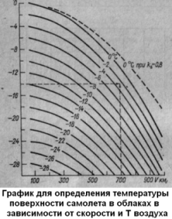 Для определения условий обледенения в облаках на эшелоне полета самолета по графику оценивается температура поверхности самолета по температуре воздуха на этой высоте и скорости полета. Отрицательные значения температуры поверхности самолета свидетельствуют о возможности его обледенения в облаках, положительные — исключают обледенение.