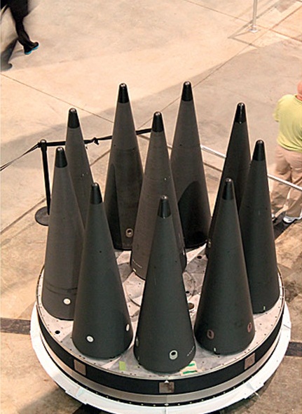 На фото: Ступень разведения ракеты МХ Peacekeeper, насчитывающая десять боевых блоков. Ракета снята с вооружения. Баллистические ракеты с разделяющейся ГЧ у американцев установлены только на подводных лодках.