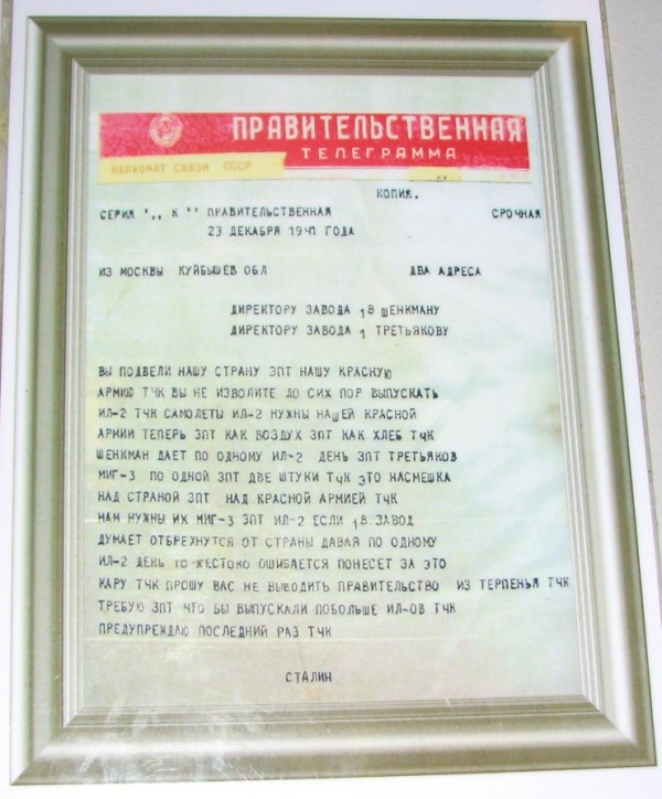 Причём, недовольство главы государства связано и с выполнением оборонного заказа. «Вы подвели нашу страну ...нашу армию», говорится в документе. Из текста телеграммы также видно, что глава государства находится в крайней степени раздражения и недвусмысленно даёт понять, что виновные могут понести наказание: «Если ... думает отбрехнуться от страны ... , жестоко ошибается и понесёт за это кару. Прошу вас не выводить правительство из терпения. Требую, чтобы выпускали больше Илов. Предупреждаю в последний раз».