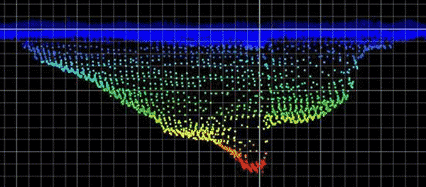 А дальше пошла история про применение компьютеров и суперкомпьютеров в космонавтике. Вышеупомянутое изображение было отправлено в ЦУП. Посредтсвом компьютеров, разумеется. ЦУП выдал команду построить трехмерный скан каверны, используя штатную систему лазерно-допплеровского сканирования (опять компьютеры). Была получена следующая картинка: