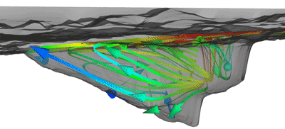 Было исследовано пять вариаций повреждений (в начале не было полной определенности с формой каверны). Вот вычисленная модель  обтекания, уже по результатам лазерного сканирования каверны. Цвет стрелочек соответствует максимальной температуре плазмы.