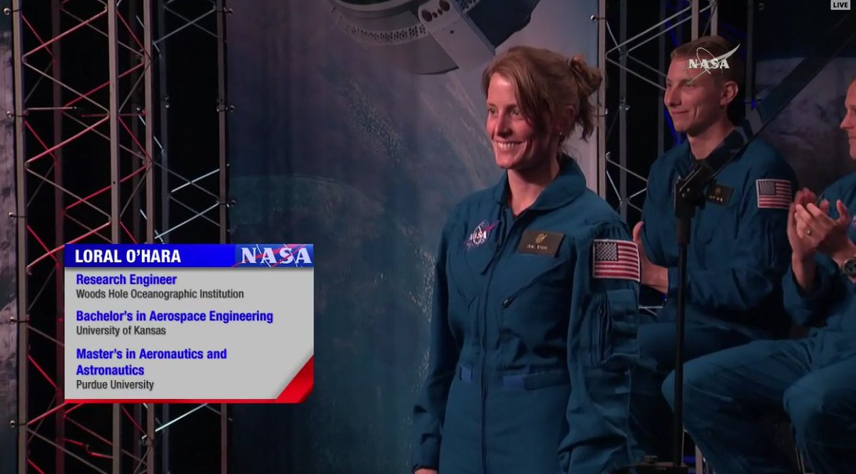 • Loral O'Hara, a 34-year-old research engineer at Woods Hole Oceanographic Institution in Woods Hole, Massachusetts, who calls Sugar Land, Texas, home. O'Hara received her a Master's degree in propulsion and fluid dynamics from Purdue University in Indiana. As a student, she participated in NASA's KC-135 Reduced Gravity Student Flight Opportunities Program, the NASA Academy at the agency's Goddard Space Flight Center in Maryland and interned at NASA's Jet Propulsion Laboratory (JPL) in California.