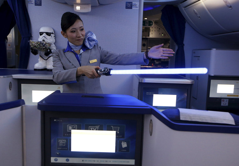 Объяснять правила поведения на борту стюардессам помогают настоящие световые мечи.