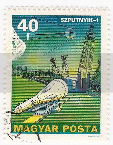 А вот марочка!  :) Посвящена запуску первого спутника. Выпущена в Венгрии.