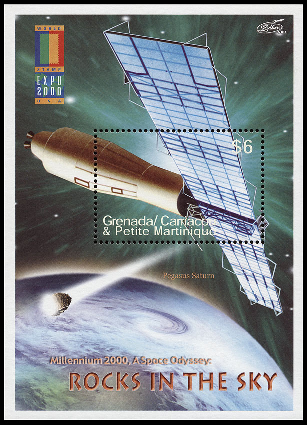 Гренада (Кариока и Малая Мартиника), 2000 год. Это тоже рисунки Александра Лоллини к нью-йоркской филателистической выставке "Экспо-2000". На поле первого марочного листа - звёздные исследования - плутониевое транспортное средство "Нострома" на 2000000 гигатонн: