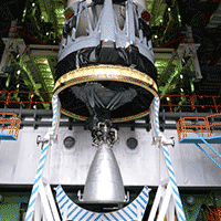 The second stage uses liquid fuel - Unsymmetrical Dimethylhydrazine (UDMH) with Dinitrogen Tetroxide. This stage - L 110 - has two advanced Vikas engines and will burn for 200 seconds. The upper, third stage uses a more powerful version of the cryogenic engine used on the recent GSLV D-5 mission. The engine has been designated CE-2O and uses Liquid Oxygen and Liquid Hydrogen as fuel. Theoretically, this stage will burn for 580 seconds, but the April flight being an experimental one, the cryo stage won't be carrying propellant.