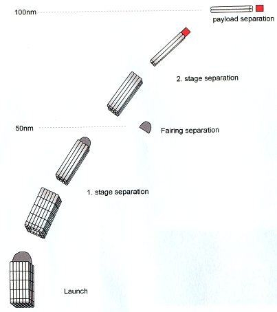 Второй проект - обычная многоступенчатая пороховая ракета с вертикальным стартом. Думаю, 3 ступени вполне достаточно, УИ около 2000 м/с. Плюс - небольшие начальные затраты. Минус - высокая стоимость ПН.