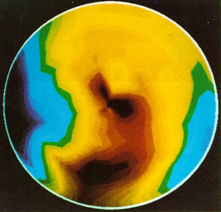 This view of Venus, a color-coded temperature map made by the Pioneer Orbiter infrared radiometer, shows some of the planet's circulation patterns. Venus's north pole is at the center, with the surrounding hemisphere showing time of day (noon at the bott om, midnight at the top). The colors represent temperatures ranging from cold (dark blue) to hot (dark red). Not surprisingly, directly under the noonday Sun temperatures are the hottest; but it is warmer at midnight that either morning or afternoon, in dicating that winds or circulation patterns have carried warm air round to the dark side.