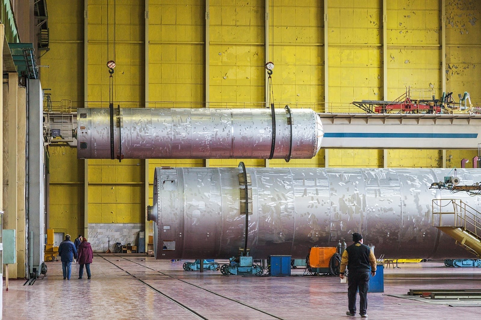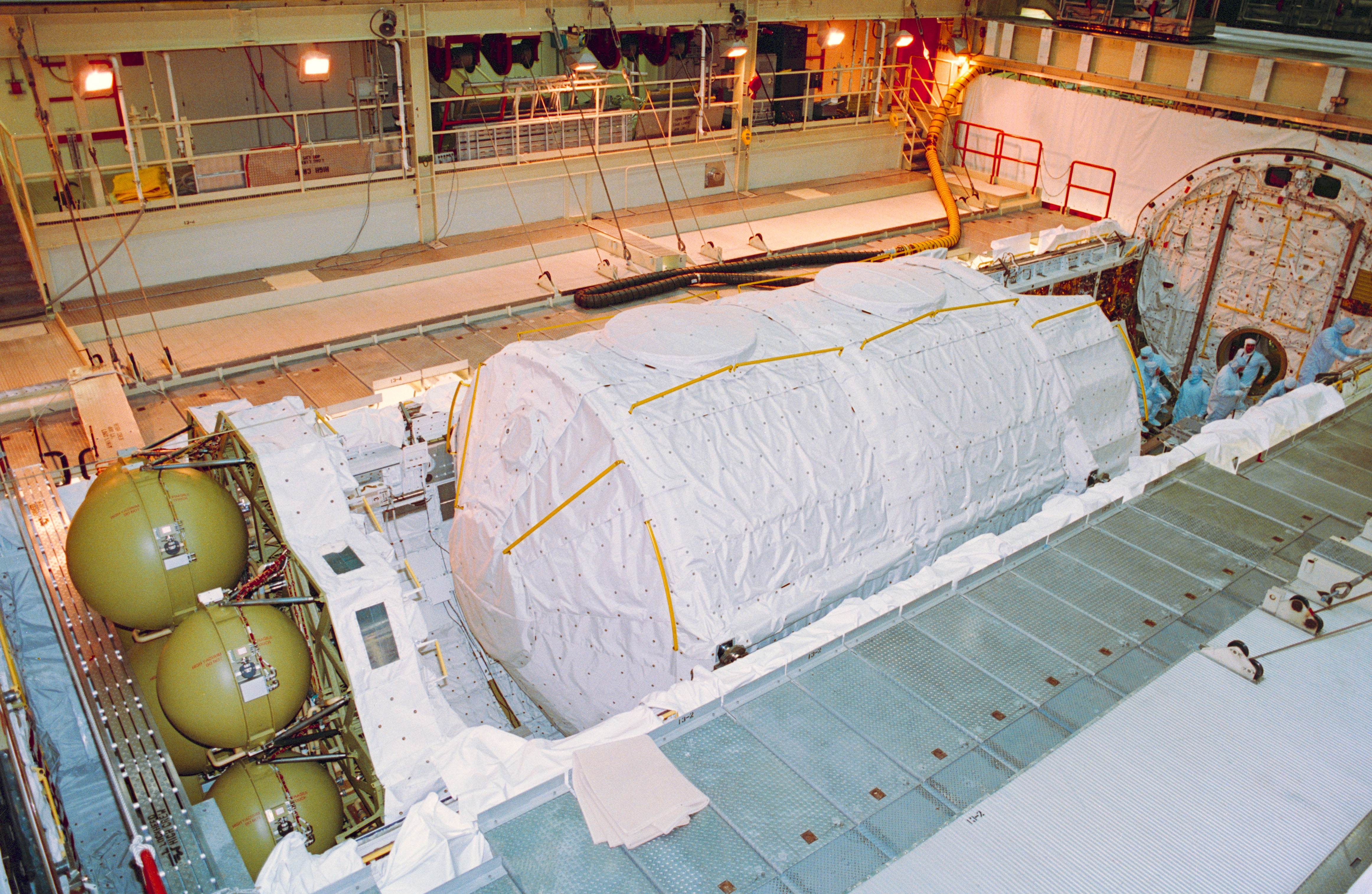 Показанный на фотографиях бак с жидким водородом (LH2) — это ранняя версия конструкции, называемая «Испытательный образец для наземных вибрационных испытаний» (GVTA). Этот бак был полностью собран вместе с баком с жидким кислородом (LOX) и межбаковым отсеком и состыкован с орбитальным аппаратом Pathfinder ( показан в предыдущем посте, нажмите здесь, чтобы посмотреть ). Эта конструкция была размещена внутри динамического испытательного стенда в Космическом центре имени Маршалла НАСА ( показан в предыдущем посте, нажмите здесь, чтобы посмотреть ), чтобы проверить, как орбитальный аппарат помещается на стенде, который был недавно расширен под размеры шаттла. Затем GVTA был состыкован с орбитальным аппаратом Enterprise и подвергался вибрации в течение нескольких часов для имитации запуска.