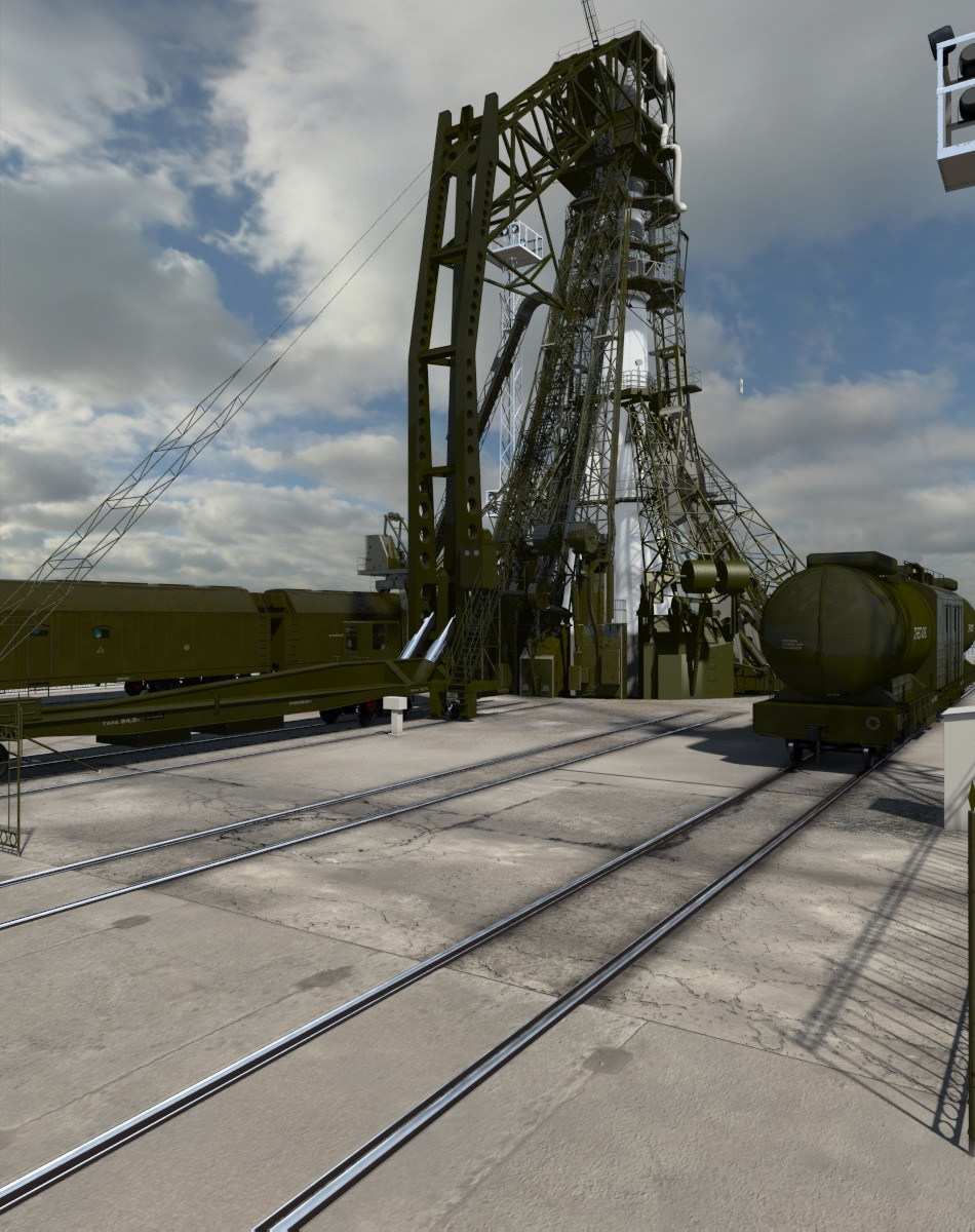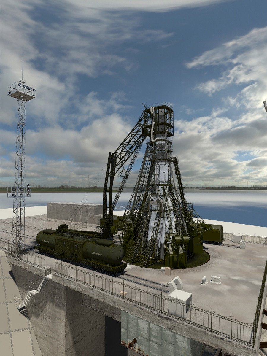 Вот Гагарин идет мимо установщика, переделанного в лифт. Все зеленое, на заднем плане торчит кислородная колонка, к которой подключаются вагоны - тоже зеленая!