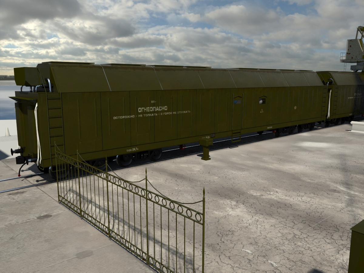 Вагоны, повторюсь, на удивление подробно расписаны по ссылкам выше. Там четко указано, какой для чего (сам не ожидал). Короткие гробы это либо 8Г52 либо 8Г54 (с виду одинаковые) - цистерны для перевозки жидкого кислорода и жидкого азота, внешне идентичны. Я их не моделил, но они есть на фото. Восьмиосные гробы на заднем плане это 8Г117 и 8Г118 - заправщик и подпитчик жидкого кислорода соответственно. Была еще куча вагонов для ЗИП, ДЭС, компрессора, сжижения паров и т.д. - все это объединалось в "кислородный поезд" 8Г59, а позже 8Г60.