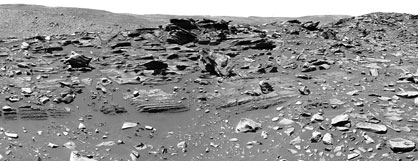 After scientists had identified Home Plate from orbit, they had many theories about what it could be and what they might see. But when Spirit's panoramic camera (Pancam) took this and other images, the science team was stunned. This Pancam image is of an outcrop nicknamed "Barnhill" and surrounding rocks on the north side of Home Plate, showing the most spectacular layering that Spirit has seen.