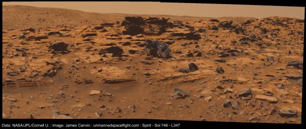 Spirit took this mosaic of images using the panoramic camera on the rover's 746th day, or sol (Feb. 7, 2006), of exploring Mars. Scientists are acquiring and processing image data for more views of the same terrain in approximate true color.