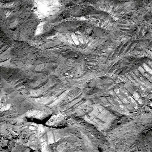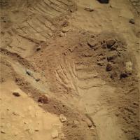 Sol 1388: Spirit drove 3.43 meters (11.3 feet), finally breaking free from the piles of soil built up around each of its wheels. The rover acquired post-drive images with the hazard avoidance cameras.