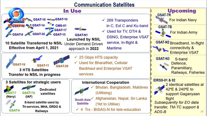 Successful launch for GSAT-20/GSAT-N2! India is currently working on the following communications satellites: GSAT-32/GSAT-N3 for NSIL, GSAT-7R for the Navy, GSAT-7B for the Army & 2 IDRSS relay satellites for Gaganyaan, with GSAT-32/GSAT-N3 set to launch in the 1st half of 2025.