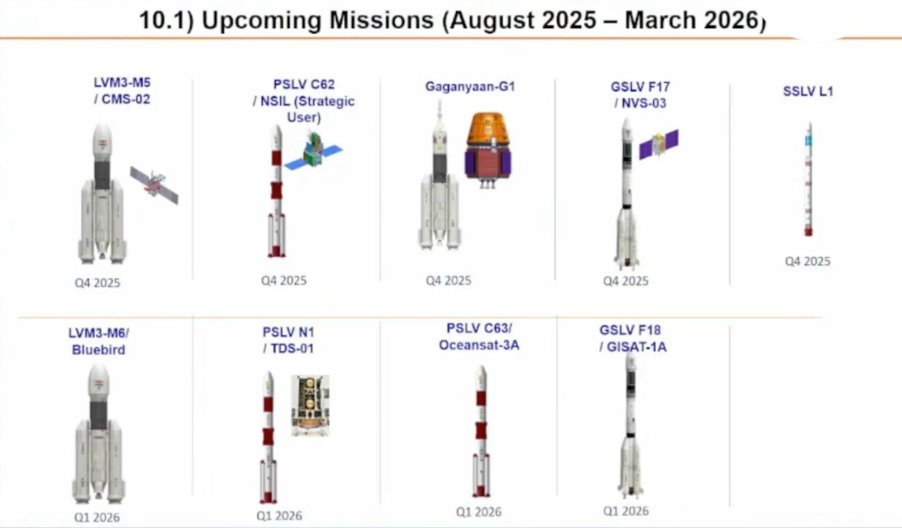 During a press briefing, the following slide with ISRO's launch schedule was shown: Most notably the LVM3 launch of AST's BlueBird Block 2 FM1 is shown for Q1 2026, but while talking about the launch, ISRO's Chief said it is "2 or 3 months away" (which would be Q4 2025).