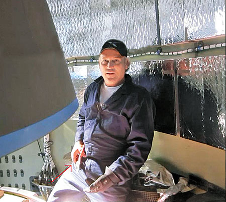 2. Марти за работой, внутри межступенного пространства, со знаменитыми ножницами по металлу в руках