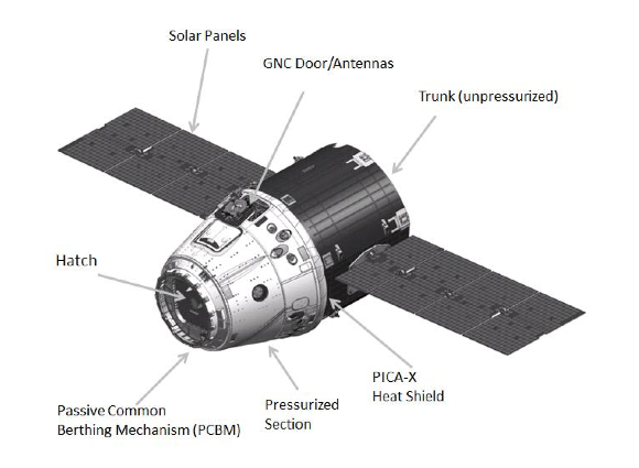 Draco Thrusters: Eighteen Draco thrusters used for orbital maneuvering and attitude control (providing system redundancy). Powered by nitrogen tetroxide / monomethylhydrazine (NTO/MMH) storable propellants; 90 lbf (400 N) thrust used for on-orbit maneuvering, de-orbit burns, and re-entry attitude.