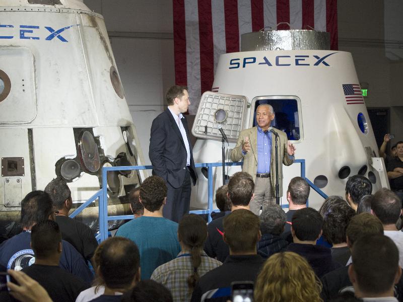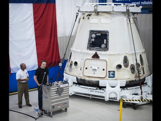 SpaceX CEO Elon Musk and NASA Administrator Charles Bolden in front of the Dragon capsule. (Credit: NASA)