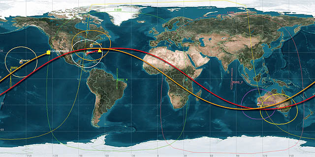 Image above illustrates COTS Demo 1 mission orbital path. The yellow triangle over the Atlantic ocean marks Dragon's initial separation from Falcon 9, and the yellow square off the Western coast of the United States marks the location wh ere Dragon landed.