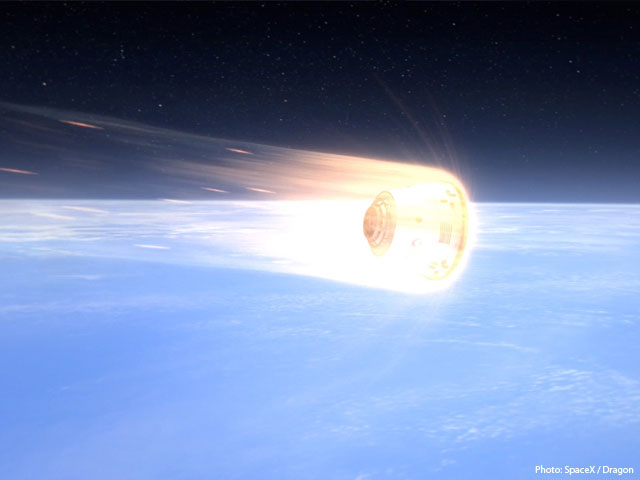 Artist's rendition of Dragon, thermally protected by SpaceX's PICA-X advanced heat shield, reentering Earth's atmosphere.