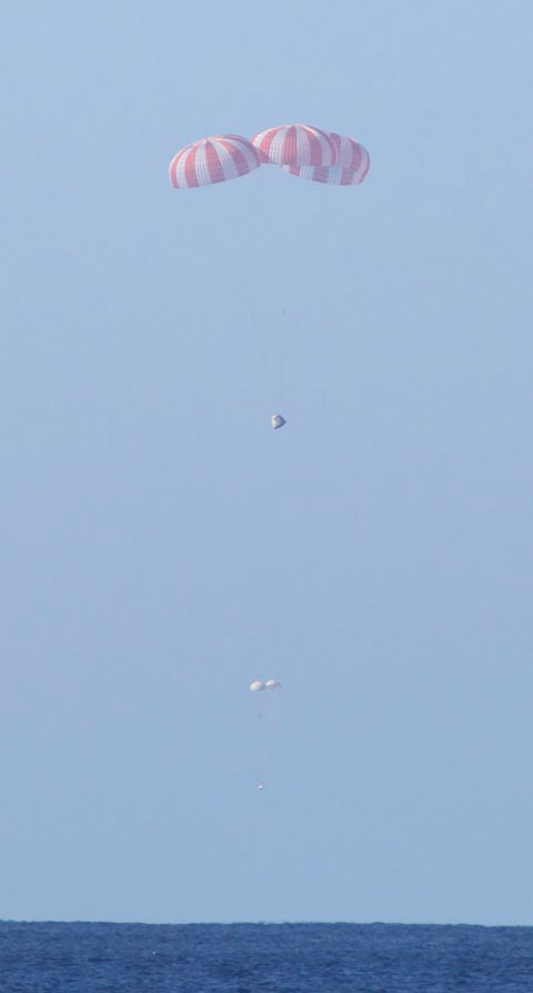 Dragon's three main parachutes fully deployed. Below float two drogue parachutes which deployed first to slow and stabilize the spacecraft.