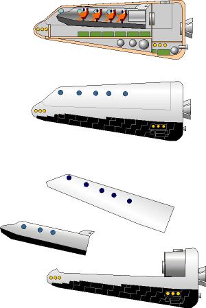 Serb, а не хочешь попробовать нарисовать сабж? Агрегатный отсек союзовский, тело в длину ОО и СА Союза, крылья и шасси (низкоплан) скрыты под экраном, тоже многократным спасаемым парашютом. Остекление кабины - над стыковочным узлом :)?