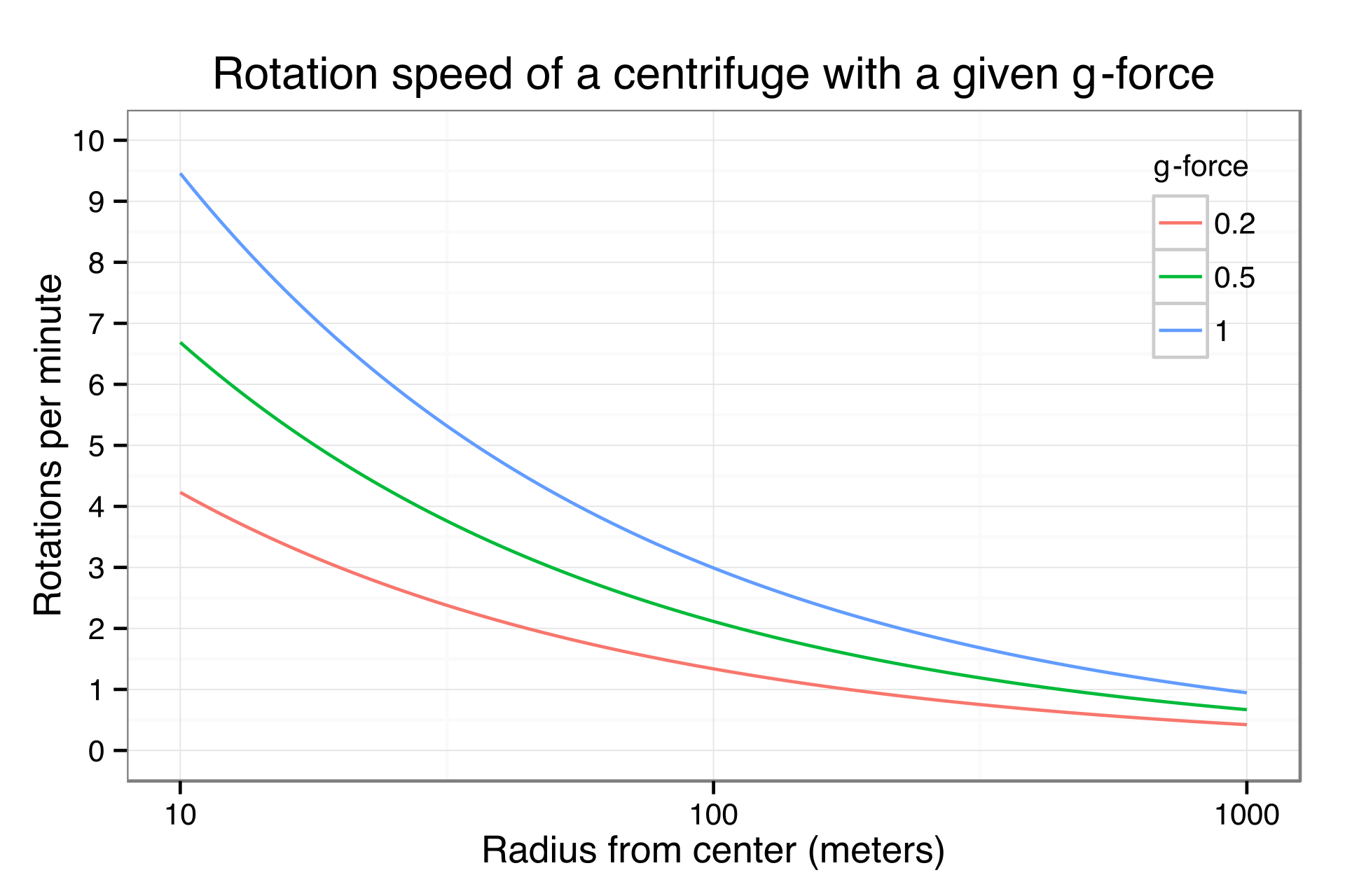 Так а что не так? Значения частоты вращения создающего негативный эффект от силы Кориолиса известны это 20+ оборотов в минуту примерно. Смотрим на таблицу, узнаем что для 10м радиуса мы можем не создавая проблем раскрутить до 5 оборотов и получить 0,2g, вполне достаточно для того чтобы появились верх и низ.