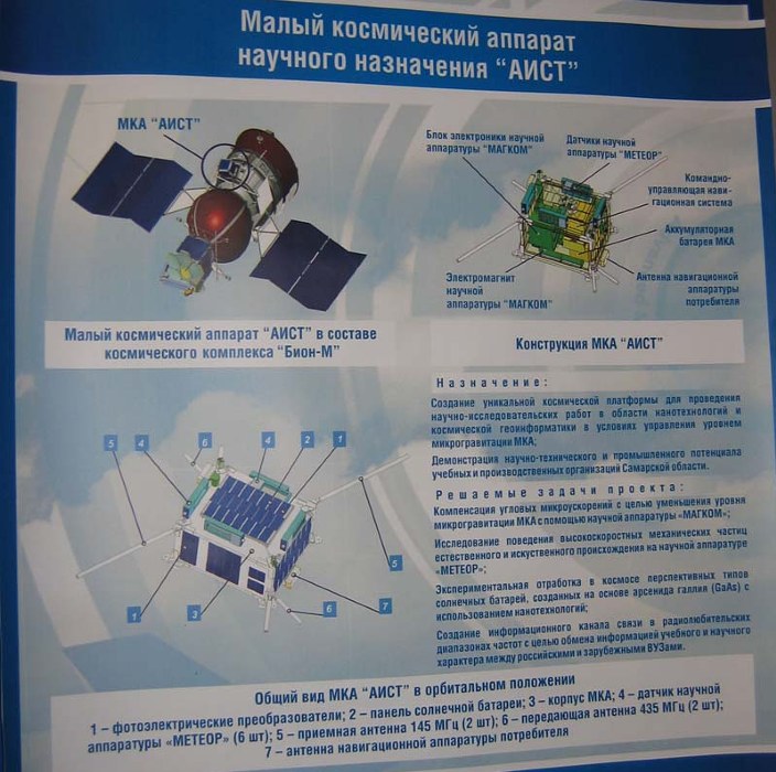Экспозиция расположилась в музее университета. Она организована СГАУ и ЦСКБ "Прогресс". В частности,  представлен малый студенческий космический аппарат "Аист". Как рассказал аспирант СГАУ, начальник группы ЦСКБ "Прогресс" Сергей Сафронов, сейчас разработкой аппарата занимаются студенты университета при поддержке сотрудников завода. Он пояснил суть проекта: "Аппарат предназначен для решения образовательных, научно-технических и экспериментальных задач. На нем устанавливается научная аппаратура для отработки алгоритмов компенсации микроускорения на борту космических аппаратов и для исследования поведения высокоскоростных механических частиц естественного и искусственного происхождения. Эта аппаратура разрабатывается в стенах университета студентами и аспирантами. Запуск летного образца "Аиста" запланирован на 2012 год".