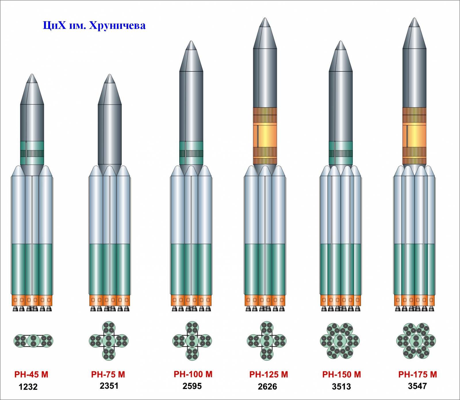 Первая слева - ДвуЗенит, три следующие - ЧетырёхЗенит, две крайние справа - ШестиЗенит. Имхо всё красиво, именно то, что нужно: от коммерции до лунного однопуска на унифицированных ракетных блоках.