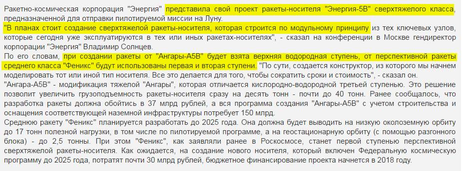 Бу-га-га :D  У меня оригинал интервью а в известиях отредактированнный. А я что, по другому сказал? :o  Ещё раз для неопытных: 1и 2 ступени связка из 5-ти блоков Феникса, а 3-я ступень водородная от А5В, что соответствует концепции АА Медведева ;)  Есть ещё вариант - Энергия-5ВР с увеличенной водородной ступенью А5В :!: