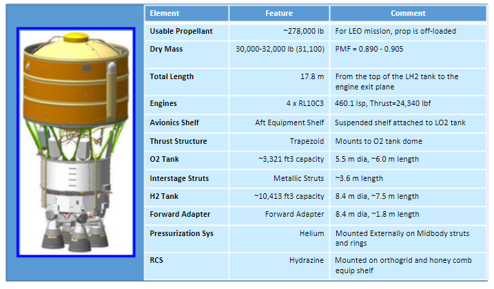 Сухая масса без 4 моторов равна 31 100 lb - 4*508 (угу, всего 200 кг на мотор) = 29 068 lb. Т.к. объём баков при чисто водородном топливе будет раза в 3 больше, масса баков примерно также вырастет, до 87,2 klb, или 43 тонн (нормально так). При примерно 139 тоннах используемого топлива. т.е. 3.2 массы топлива на 1 массу конструкции даже без учёта движков и их тяги... Чтобы быть конкурентоспособным с EUS, ступень должна запускать примерно 35-40 тонн. Т.е. примерно столько же, сколько весит топливный бак. Тогда соотношение стартовая/конечная масса падает ещё сильнее... Короче, с натягом цифры сходятся.