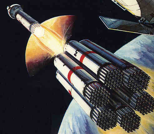 Ну тогда зачем Союз-5?  Всё для доступного не оптимального супертяжа уже есть. К тому же полностью в ж/д-габарите.  Первая вторая и третья ступень - это связка из 19 УРМ1.  1 по центру, 6 в первом ряду и 12 во втором.  Диаметр - 12м. Тяга на старте - 19х196=3724 тонны.  Стартовая масса 2400 тонн.  При достижении перегрузки 3g на 80 секунде дросселируют внутренние УРМы, а потом на 120 секунде внешние через один.  Соответственно - и отделяются в обратном порядке - 6 внешних через один потом 6 внешних оставшихся.  Далее связка из 7 внутренних УРМов с дросселированием 80% разгоняет 4-тую ступень (здесь не описана) и полезную нагрузку 80 тонн до 6,5км/с. Оставшуюся скорость доведет 4-ступень.