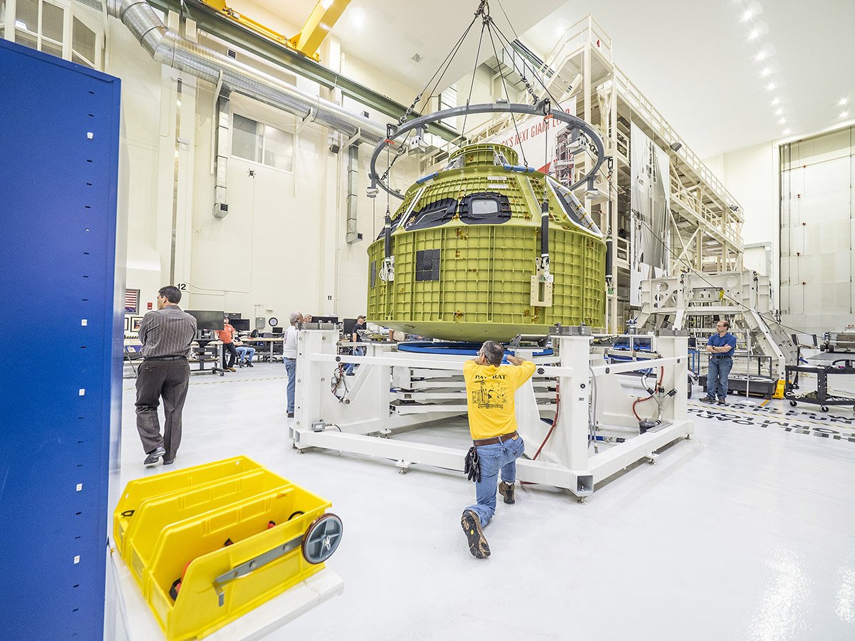 .@LockheedMartin technicians check final alignment as Orion is lowered into the work stand