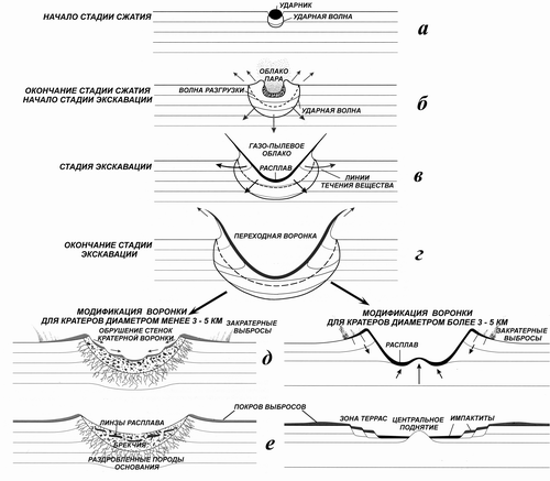 Первая стадия – так называемая контактная стадия или стадия сжатия, начинается с момента соприкосновения метеороидного тела с твердой поверхностью, в результате чего в плоскости соприкосновения метеороида (ударника ) с веществом поверхности (мишени) образуется ударная волна. (рис. 2 а,б). Благодаря высоким скоростям соударения, в начальный момент она сжимает и нагревает вещество. Так, при падении железного астероида со скоростью 30 км/сек в контактной зоне развивается давление около 1500 ГПа , что примерно в 50 раз выше давления в центре Земли, а температура сжатого вещества достигает многих десятков тысяч градусов. После сброса ударного давления при разгрузке, запасенной тепловой энергии в приконтактной зоне остается достаточно для полного или частичного испарения (в этом случае совместно с плавлением) вещества ударника и части вещества мишени. Именно этим и объясняется отсутствие видимого метеоритного вещества в взрывных метеоритных кратерах. Лишь в небольших структурах, образованных низкоскоростными железными метеоритами, как например Аризонский метеоритный кратер в США или кратер Хенбери в Австралии, на валу и в окрестностях кратеров можно найти непереплавленные обломки ударника