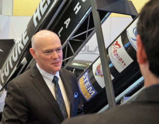 United Launch Alliance's president and CEO, Tory Bruno, talks with students during the 32nd Space Symposium in Colorado Springs, Colo. (GeekWire photo by Alan Boyle)