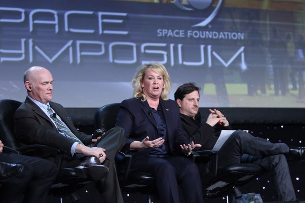 Aerojet Rocketdyne president and CEO Eileen Drake discusses her company's development of the AR1 engine during a launch panel at the Space Symposium April 14 as ULA president and CEO Tory Bruno (left) listens. (credit: Space Foundation)