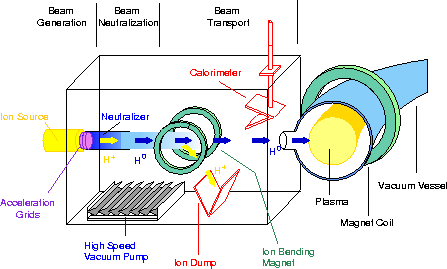 Схема стандартная: генератор плазмы, вытягиваются ионы, ускорение, нейтрализация. Модули мегаваттной мощности - стандартное средство нагрева плазмы в крупных установках. Суммарно на крупнейших машинах инжектируется до 40 МВт (ныне покойный TFTR, вроде бы больше этой цифры ни у кого нет). Тут, собственно, только цифра 90% проблемная. Да, вопрос про ток прост: если у Вас энергия пучка 20 кэВ - то это масштаба 50 ампер, если мегавольт - то соответственно 1. Хотя на мегавольте на мегаватт делать неинтересно - там обычно рисуют на 5-10. Правда, обычно подобное нарисованное не получается.