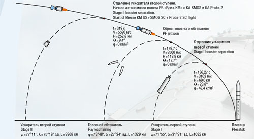 Ракета космического назначения  (РКН) "Рокот" с разгонным блоком "Бриз-КМ"   и  космическими аппаратами "СМОС" и  "Проба-2" стартовала  сегодня в 04 час. 51 мин. мск. Пуск был произведен расчетами Космических Войск космодрома Плесецк.